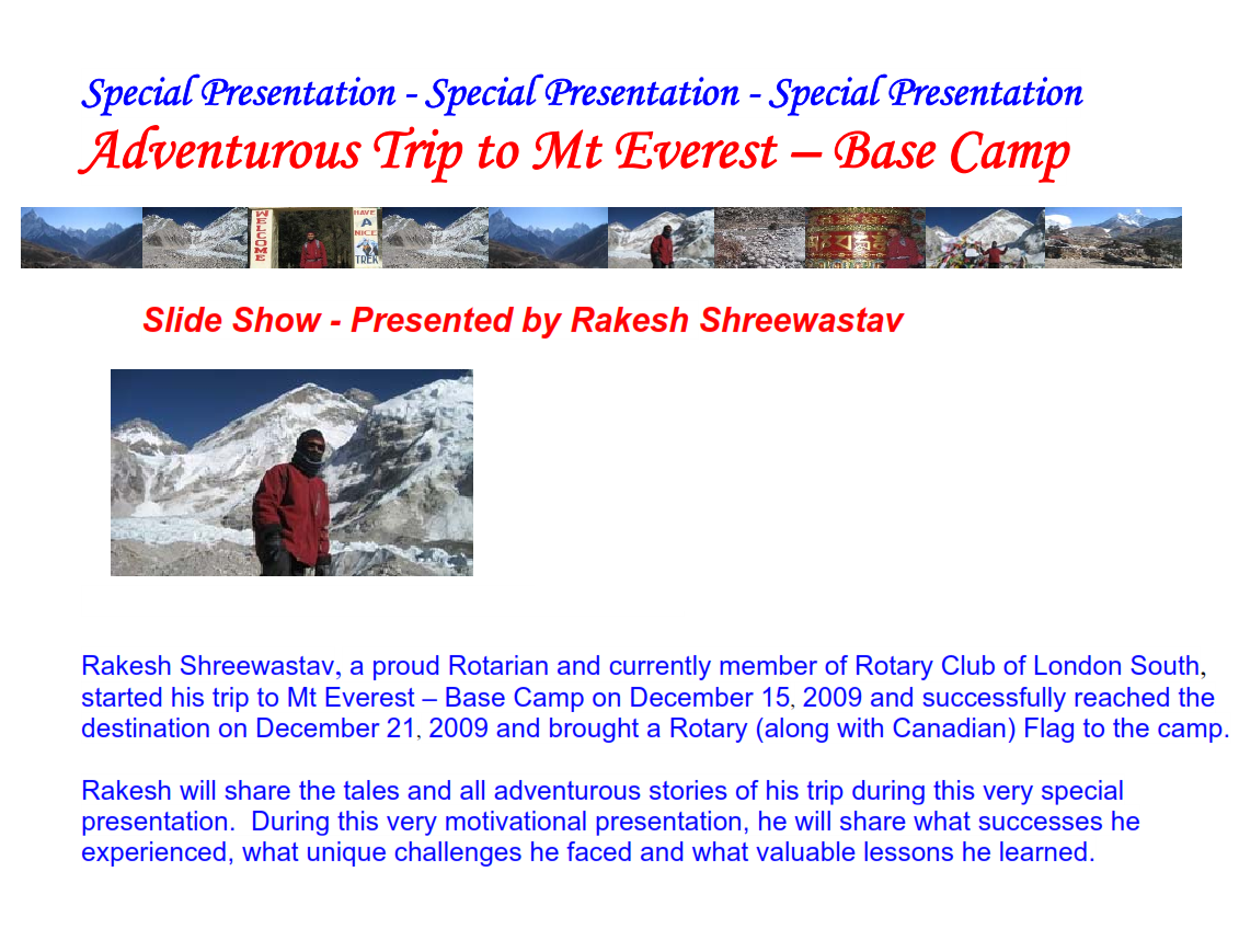 Rakesh Shreewastav, a proud Rotarian and currently member of Rotary Club of London South, started his trip to Mt Everest – Base Camp on December 15, 2009 and successfully reached the destination on December 21, 2009 and brought a Rotary (along with Canadian) Flag to the camp.