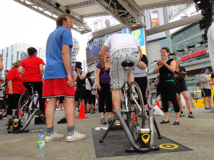 Riding bikes outdoors, going nowhwere, but making progress…what’s that you say? Yes, it’s The Inside Ride fundraiser for children with cancer. RC Toronto Skyline took part in this event at downtown Toronto’s Dundas Square.